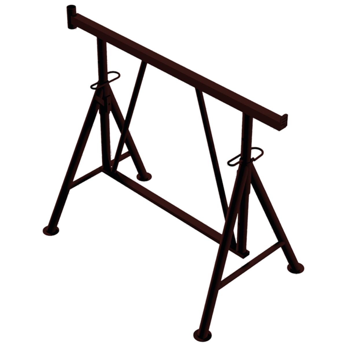Stabiler Faltgerüstbock mit Auflagetraverse, seitlich angeschweißten Rohraufnahmen für Geländerpfosten, drehbaren Standfüßen und 2 Grundplatten zur standfesten Positionierung auf jedem Untergrund. Das Obergestell mit Traverse ist ausziehbar und in mehreren Stufen mit einem unverlierbaren Haken einstellbar.