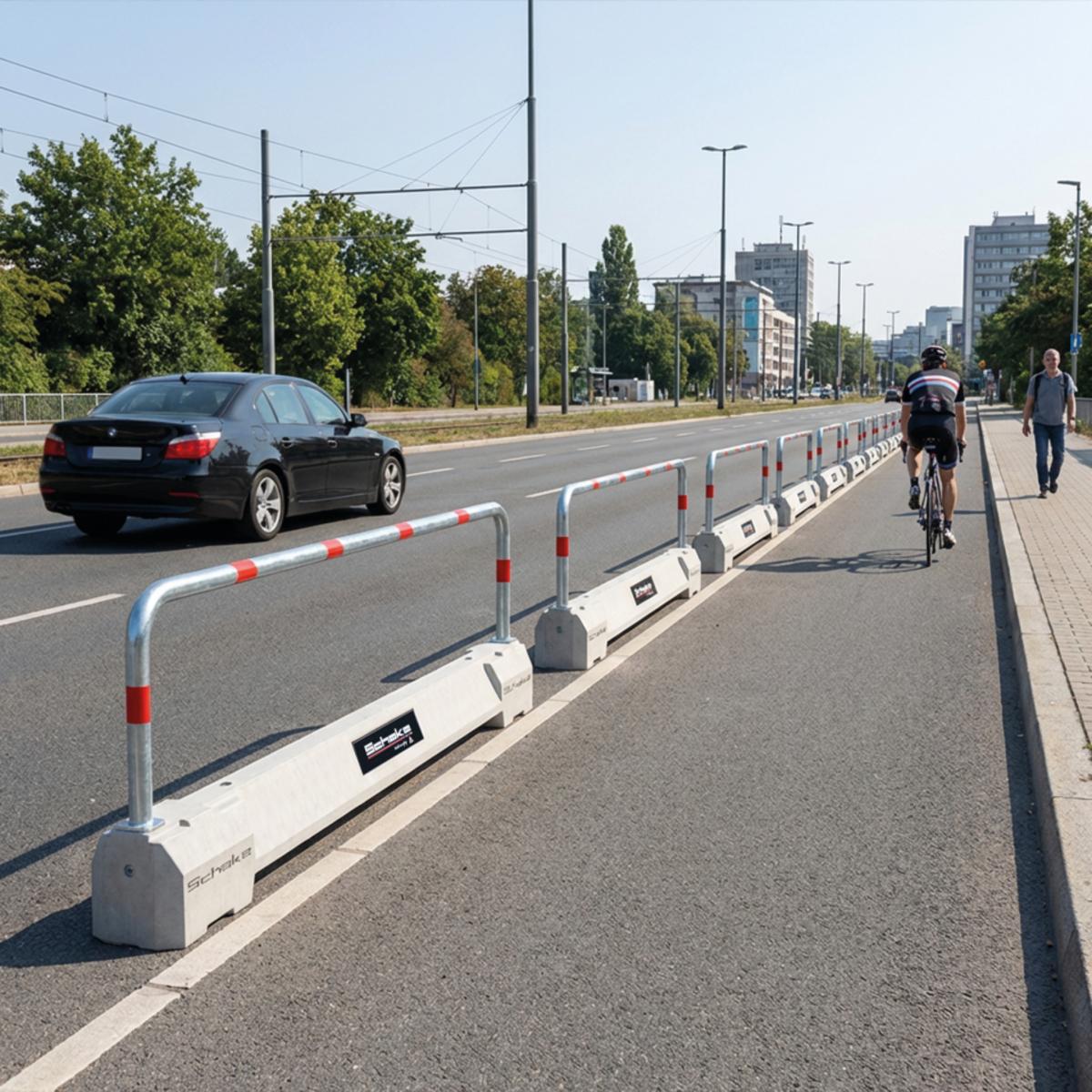 Die Betonleitschwelle mit Absperrbügel dient zur Trennung von Verkehrsflächen und Arbeitsbereichen. Sie kann per gabelstapler oder Kran bewegt werden.