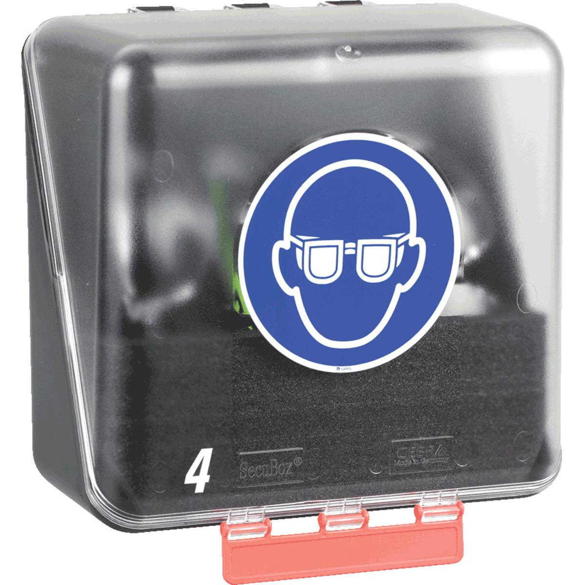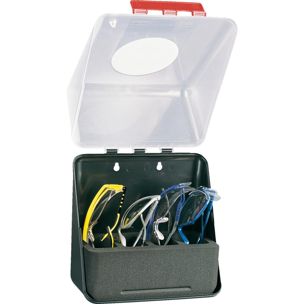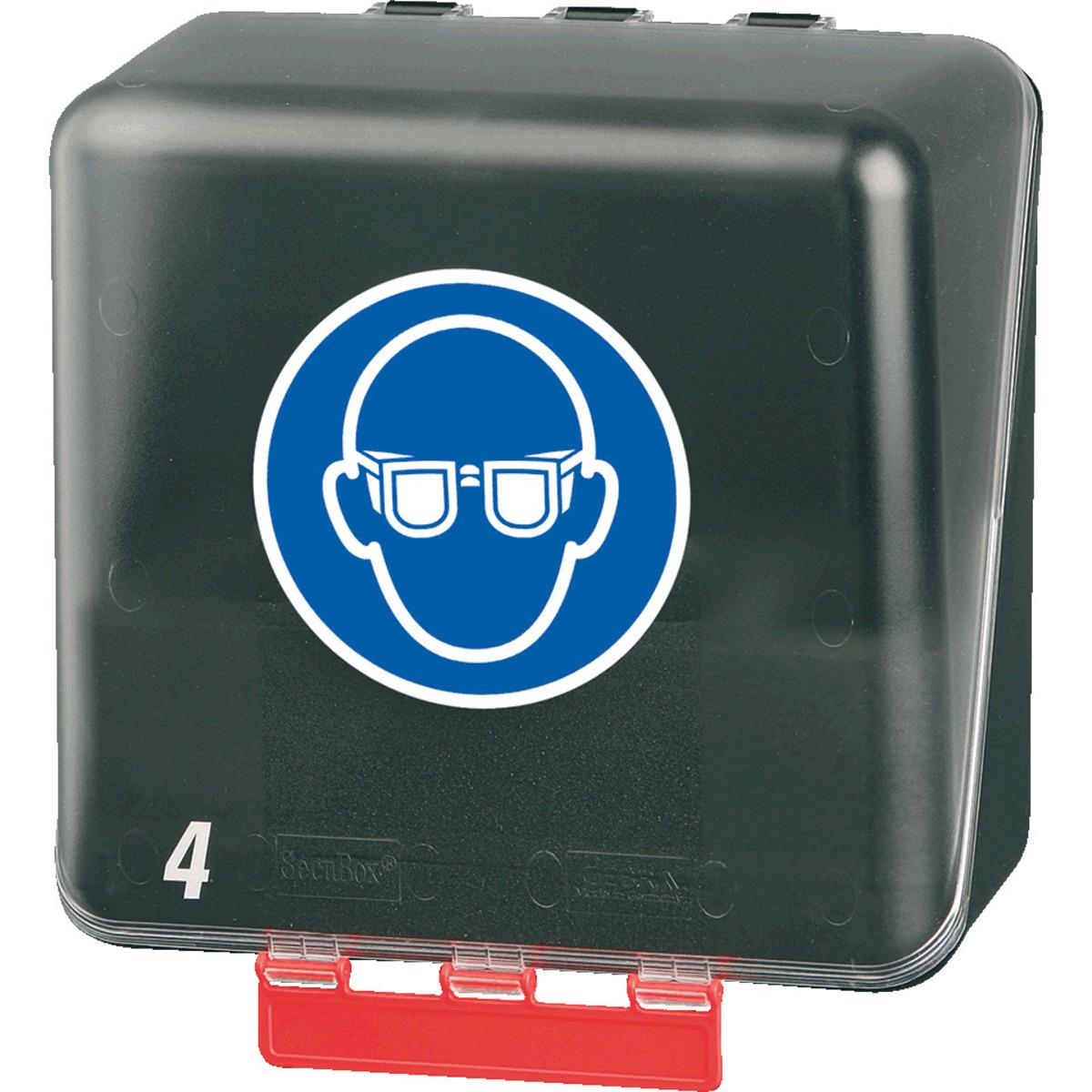 Stabile Schutzmittelbox Midi 4 für die sichere und saubere Aufbewahrung von bis zu 4 Schutzbrillen, inklusive Befestigungsmaterial und selbstklebenden Etiketten zur Personalisierung der Boxen