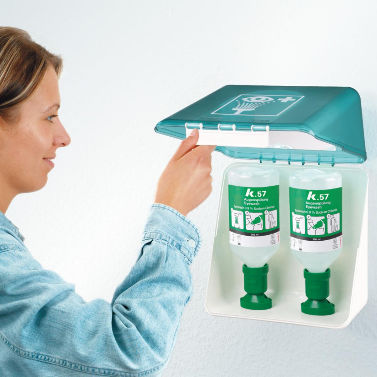 SecuBox® Wandstationen zur staub- und spritzwassergeschützen Aufbewahrung von Augenspülflaschen. Der Schutzdeckel weist im geschlossenen Zustand durch ein auffälliges Piktogramm auf die Augenspüleinrichtungen hin, bequem mit einer Hand zu öffnen und zu arretieren.