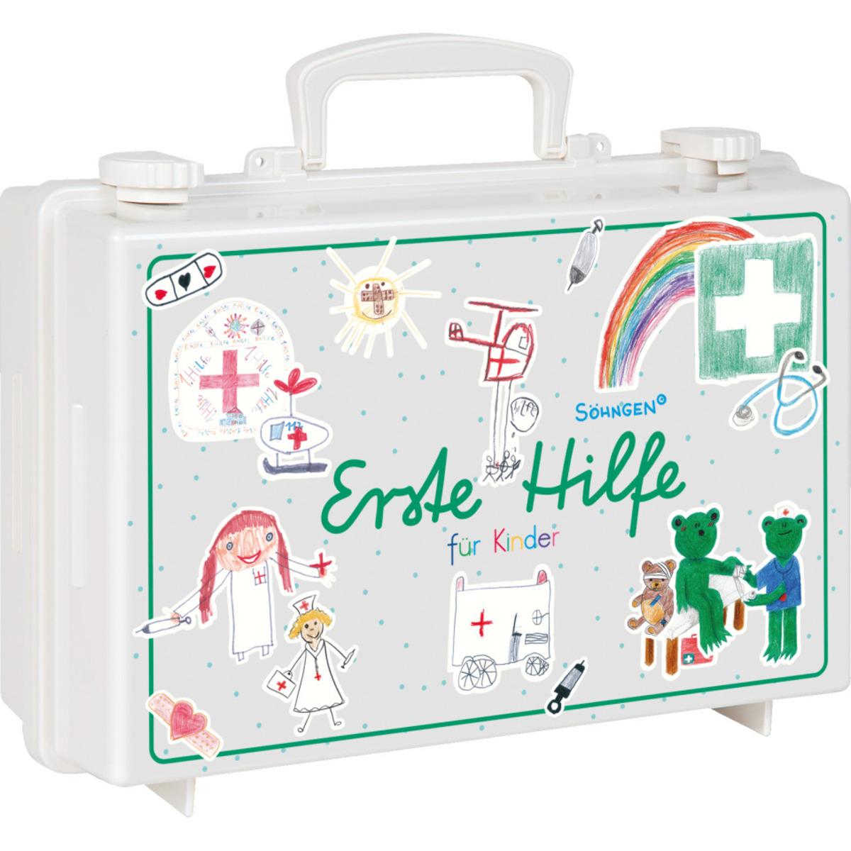 SÖHNGEN® Erste-Hilfe-Koffer mit Verbandstoffen in kindgerechten Größen und ansprechendem Design von Kindern für Kinder.