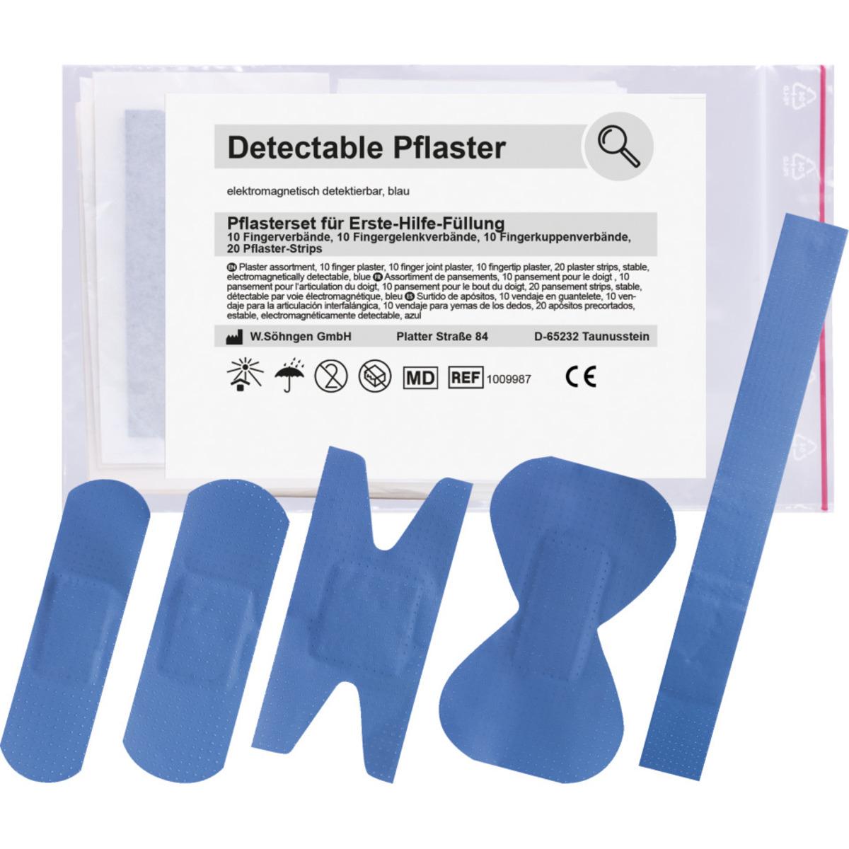 SÖHNGEN® detectables Pflasterset für die Lebensmittelindustrie. Durch eingearbeitete Metallfäden und die auffällige blaue Farbe sind die Pflaster gut zu erkennen oder maschinell detektierbar.