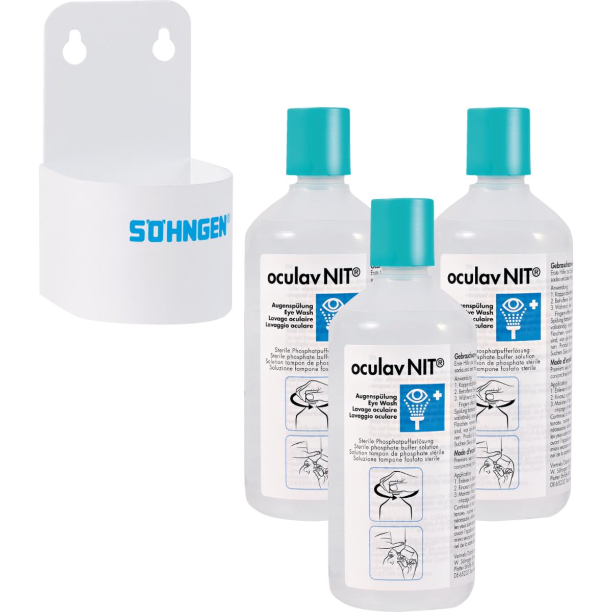Söhngen Vorteils-Set Oculav NIT® Augenspülung zur sofortigen Reinigung und Beruhigung der Augen bei Verätzungen durch Säuren oder Laugen. Mit praktischer Wandhalterung sofort griffbereit.