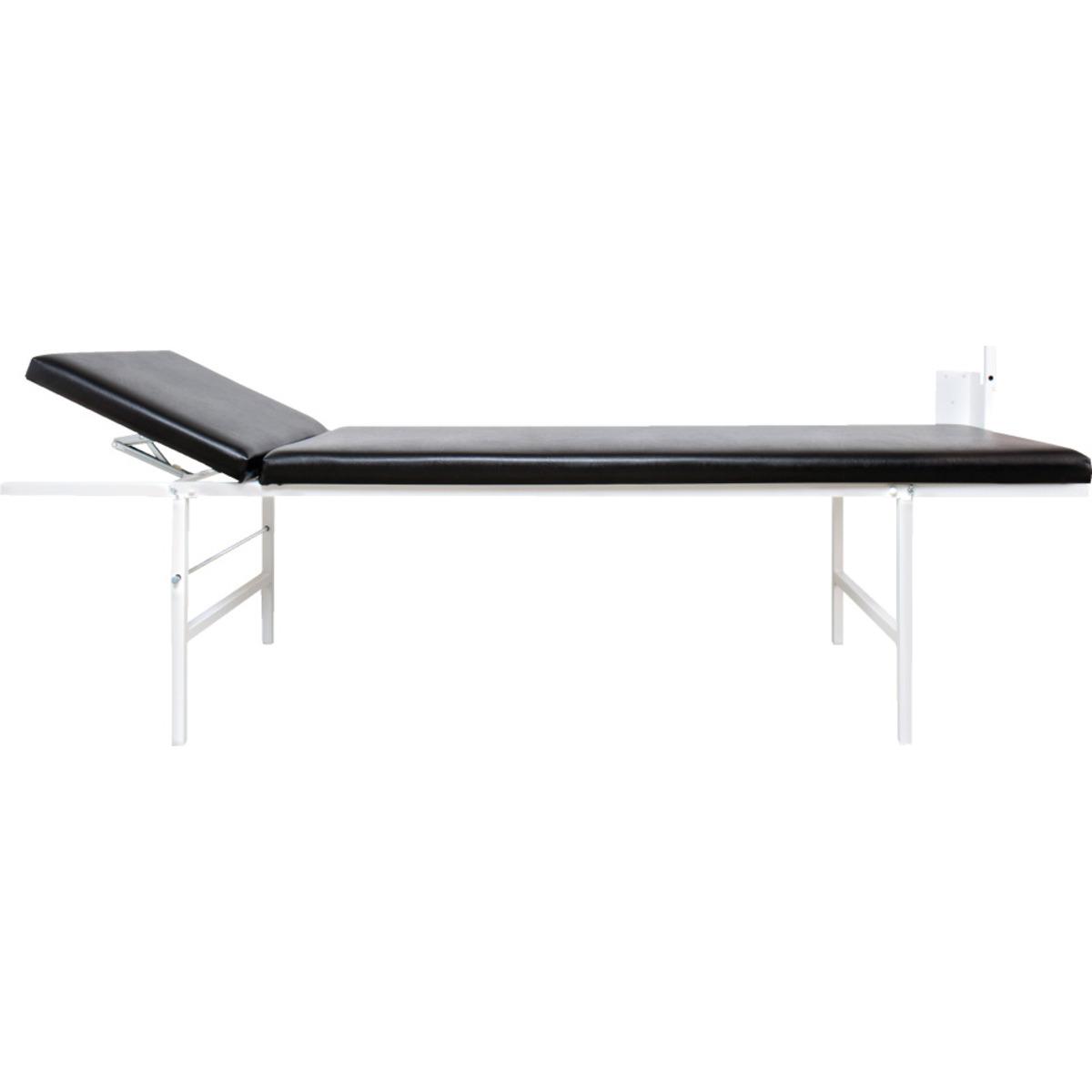 Wanklappliege für Sanitäts- und Ruheräume mit mehrstufig, verstellbarem Kopfteil und integrierter Abrollvorrichtung für Krepp-Papierrollen.