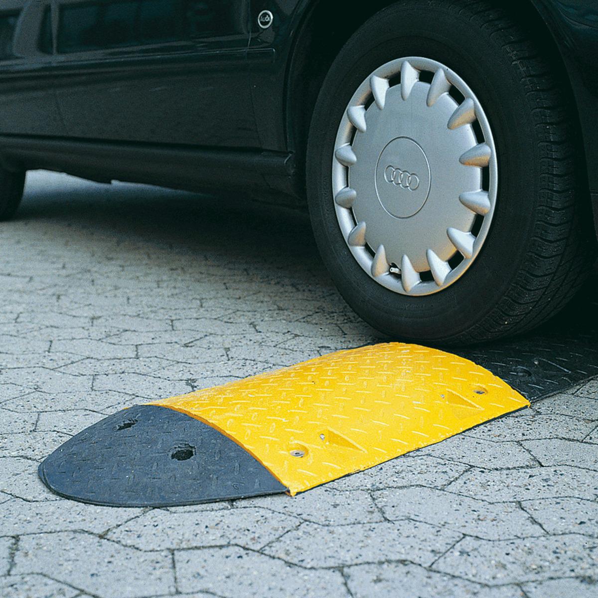 Robuste fest aufliegende Tempo-Stopp-Schwelle mit integrierten Reflektoren für gute Sichtbarkeit im Dunkeln, zwingt zur Reduzierung der Fahrgeschwindigkeit und sorgt für mehr Sicherheit auf dem Betriebsgelände, einfaches Stecksystem zum Verbinden der Elemente, kann fest verankert und sicher überfahren werden.