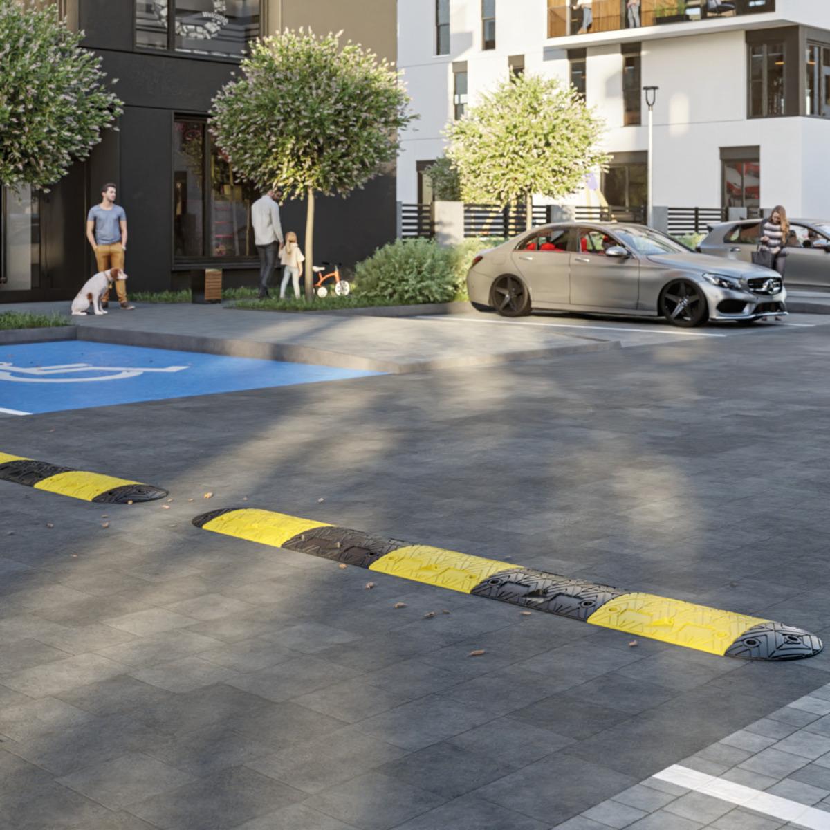 Robuste fest aufliegende Tempo-Stopp-Schwelle zwingt zur Reduzierung der Fahrgeschwindigkeit und sorgt für mehr Sicherheit auf dem Betriebsgelände, einfaches Stecksystem (Nasen) zum Verbinden der Elemente, kann zusätzlich mit Durchsteckangern festverankert werden, sicheres Überfahren der Schwelle durch strukturierte, rutschfeste Oberfläche.