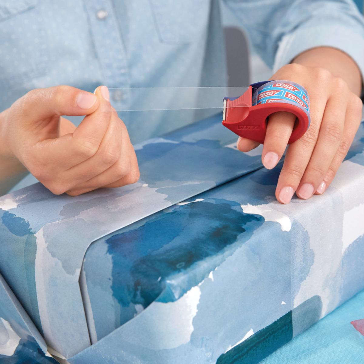 Der mobile Mini tesafilm® Abroller im ergonomischen Design mit scharfem Wellenmesser für einen sauberen Schnitt.
