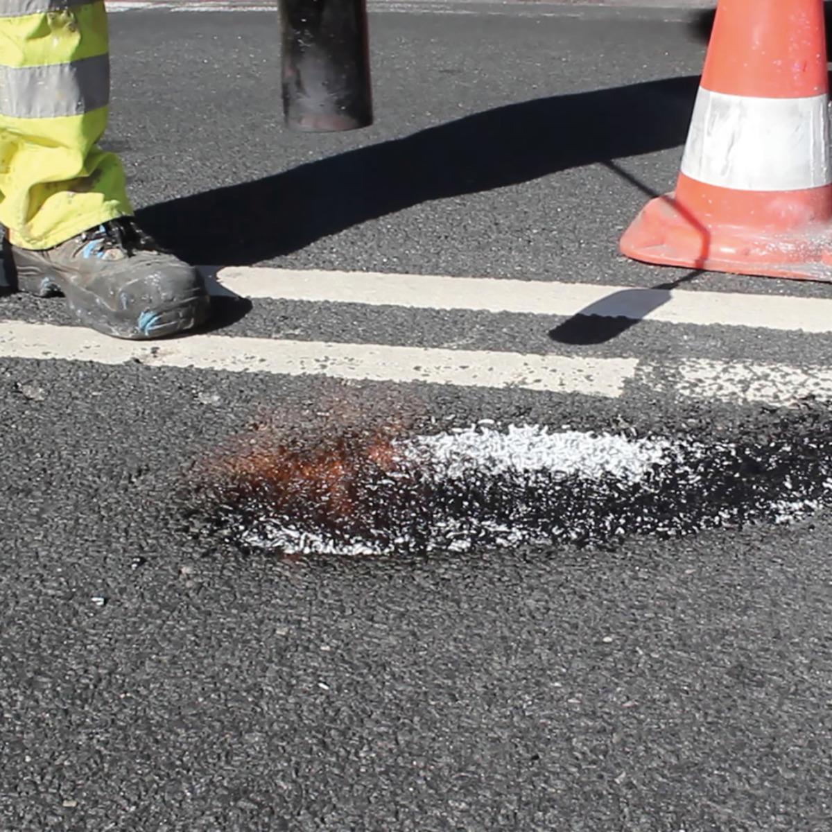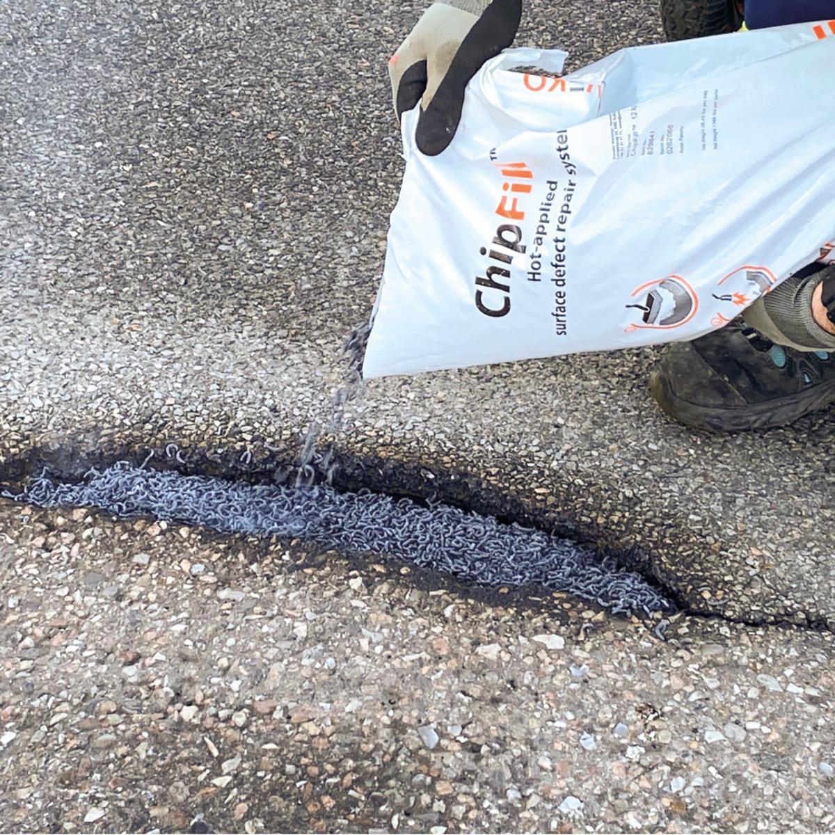 ChipFill® Thermoplastik ist speziell für die Reparatur von Rissen und kleineren Schlaglöchern (Durchmesser bis 20 cm) entwickelte Thermoplastik. Es verhindert, dass aus kleinen Beschädigungen große Schlaglöcher entstehen, kann bis zu einer Temperaturuntergrenze von 10°C verarbeitet werden, ist so konzipiert, dass es sich schnell setzt, sodass die Reparaturstelle 20 Minuten nach der Aufbringung wieder belastbar ist.