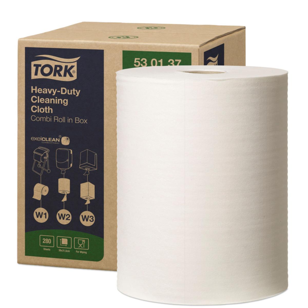 1-lagige TORK Premium 530 Reinigungstücher, sehr reißfest, durch strukturierte Oberfläche wird selbst hartnäckiger Schmutz gelöst, beständig bei Verwendung mit Reinigungs- und Lösungsmitteln, ISEGA-zertifiziert, Großrolle im Spenderkarton