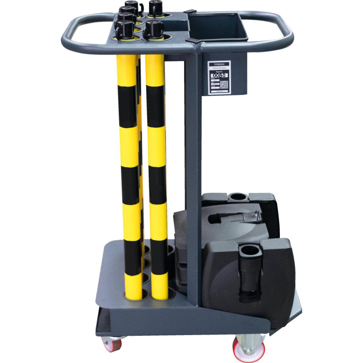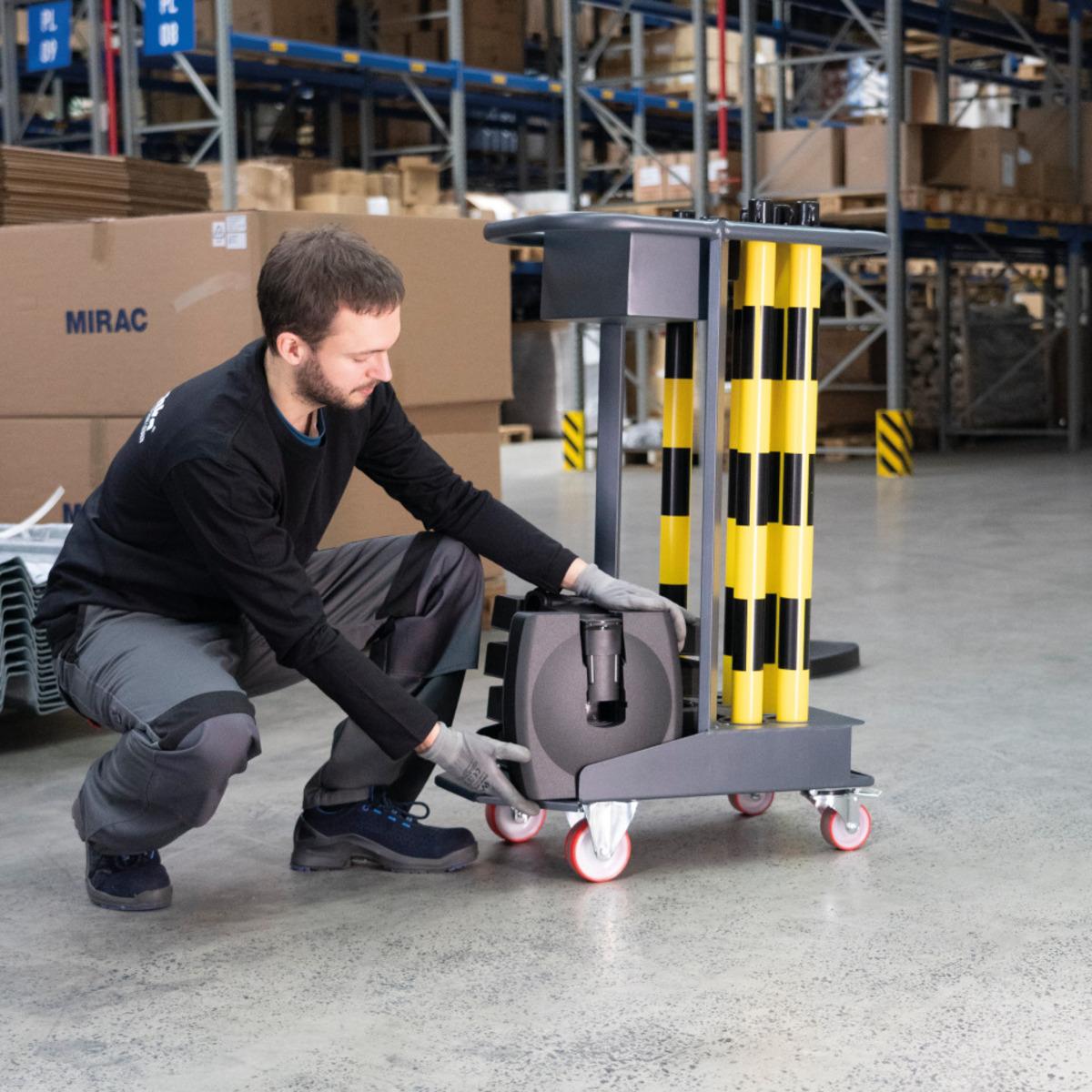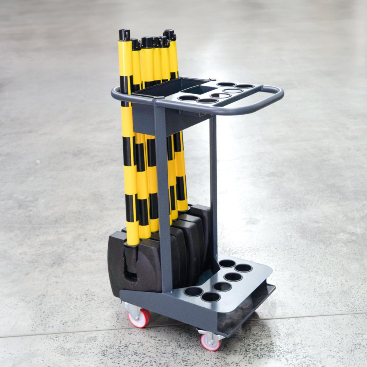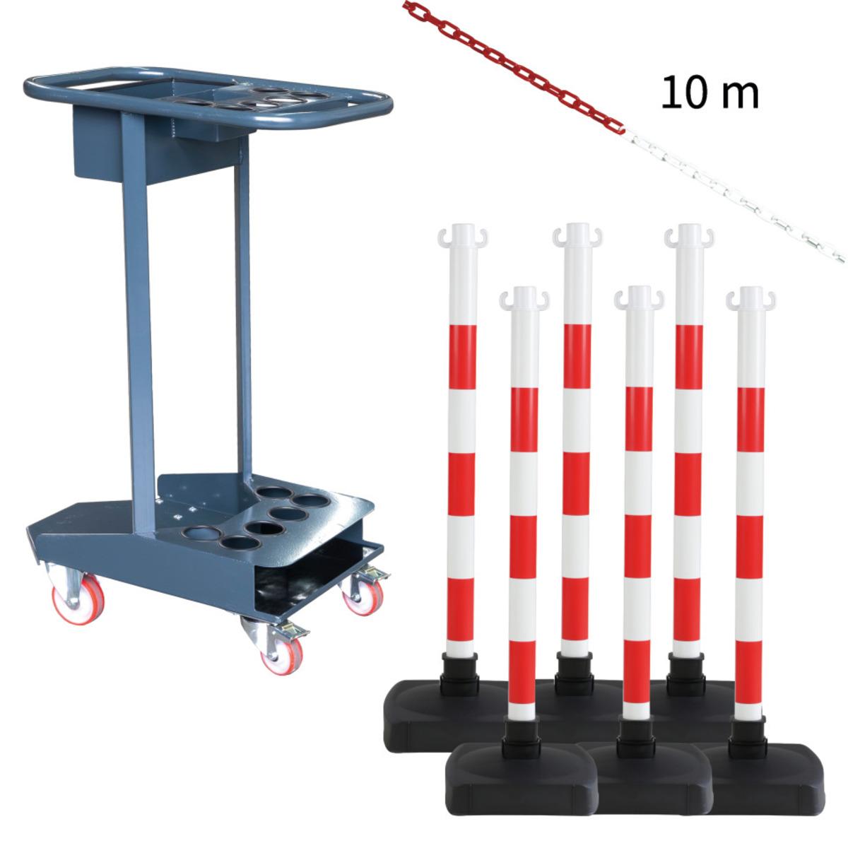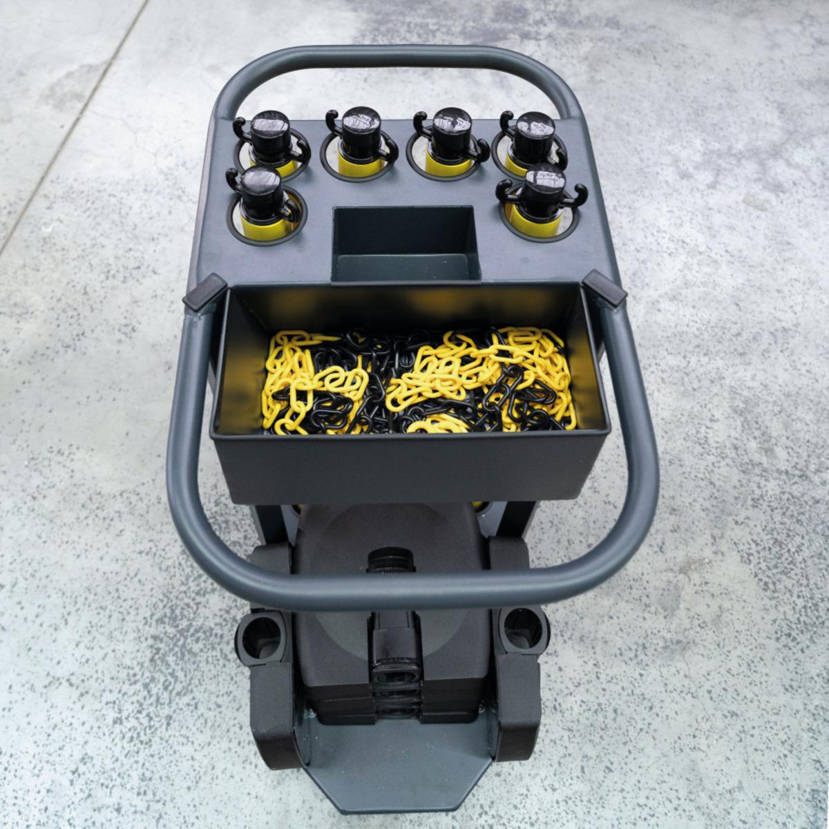 Transportwagen-Set mit Klapppfosten beinhaltet den Kettenpfosten-Wagen Caddie und Klapppfosten.