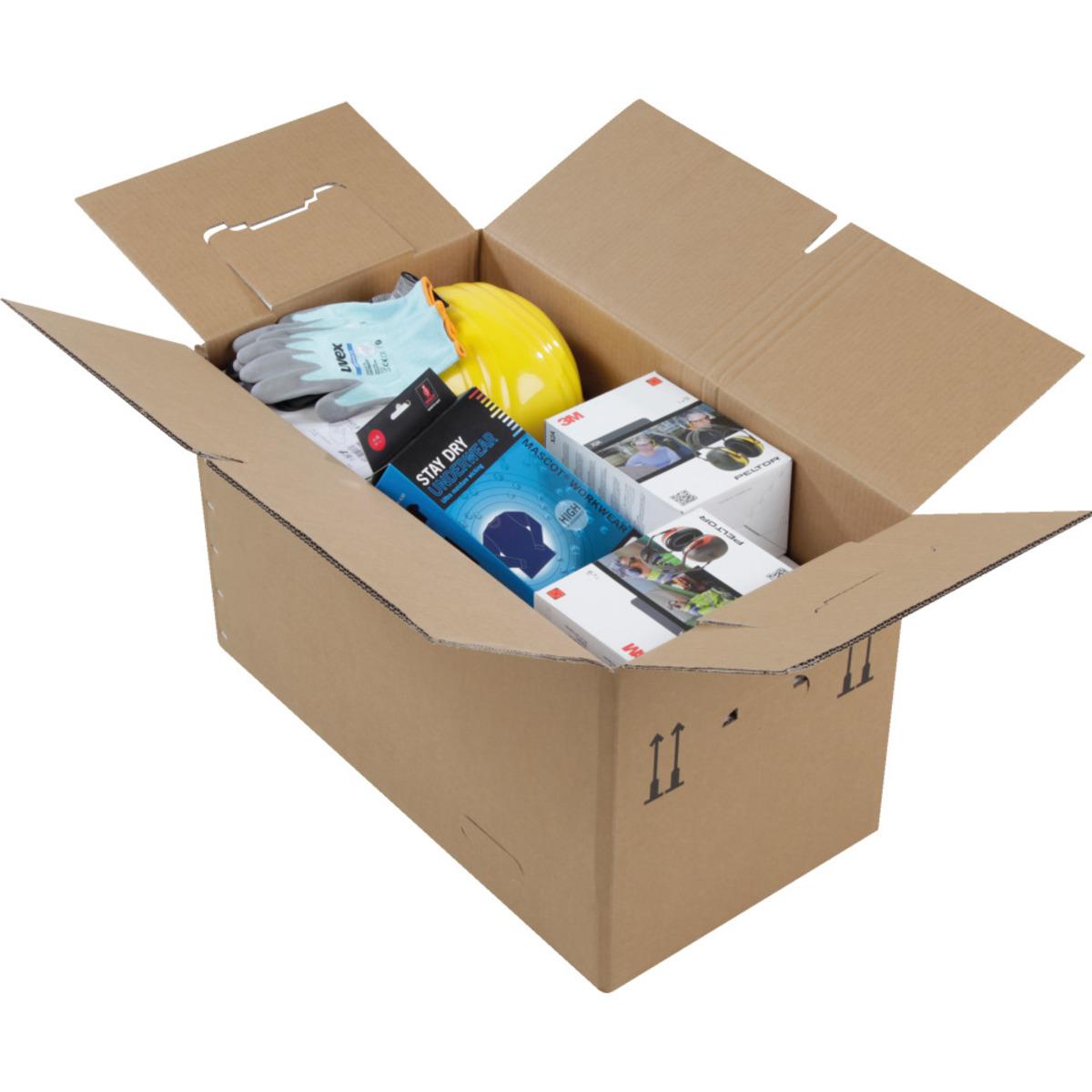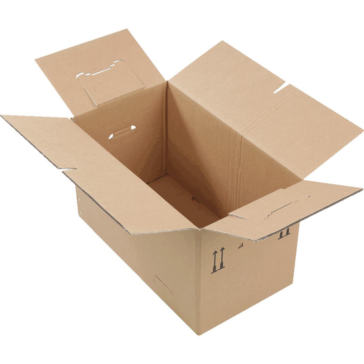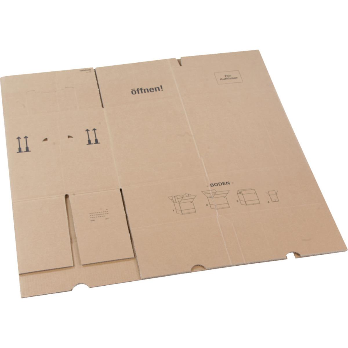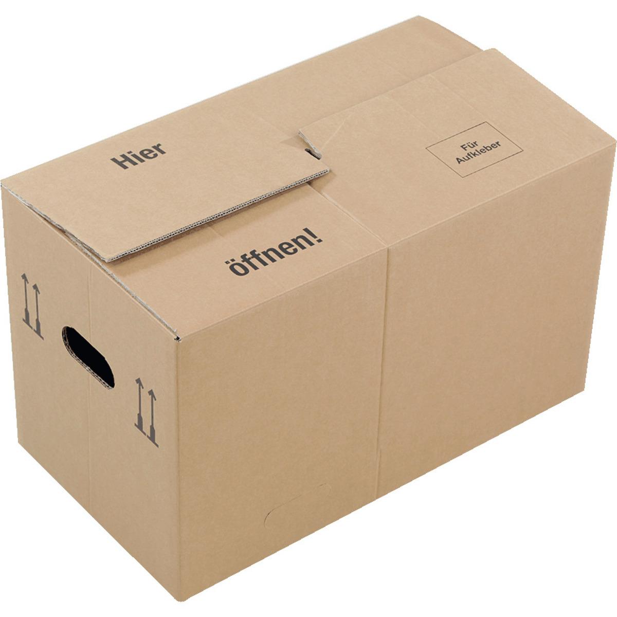 Extrem belastbarer, 2-welliger Umzugskarton. Ideal für schwerere Umzugsgüter, einfach montierbar, wiederverwendbar und platzsparend faltbar. Mit Grifflöchern, HIER OBEN- Aufdruck und ohne Klebeband verschließbar.