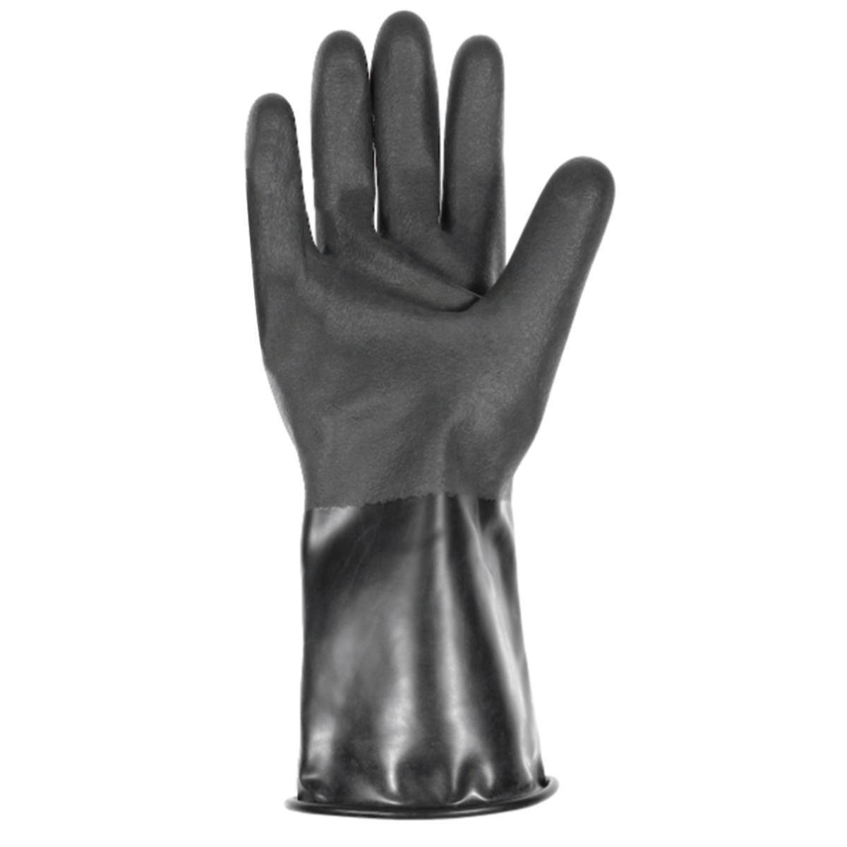 Antistatischer Chemikalien Schutzhandschuh mit guter Resistenz gegenüber polaren Verbindungen wie Ester, Ketone, Aldehyde, Amine, gesättigte Salzlösungen sowie Säuren und Laugen, gute Griffsicherheit in feuchten und nassen Bereichen.