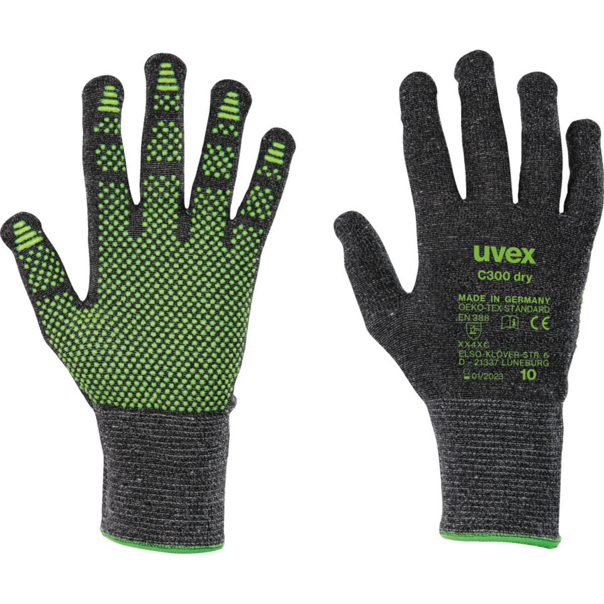 Schnittschutzhandschuh uvex C300 dry mit innovativer Punktbeschichtung von Fingern und Innenhand für optimalen Griff in trockenen Arbeitsbereichen, mittlerer Schittschutz, hervorragendes Tastgefühl, Tragekomfort und Flexibilität, silikonfrei, Strickbündchen