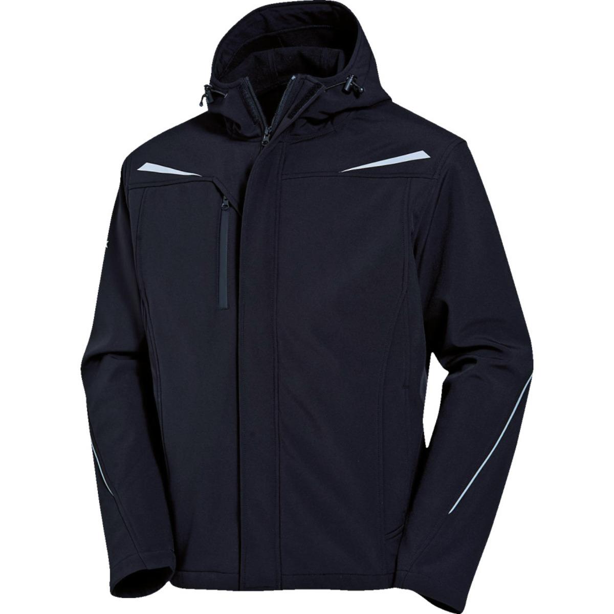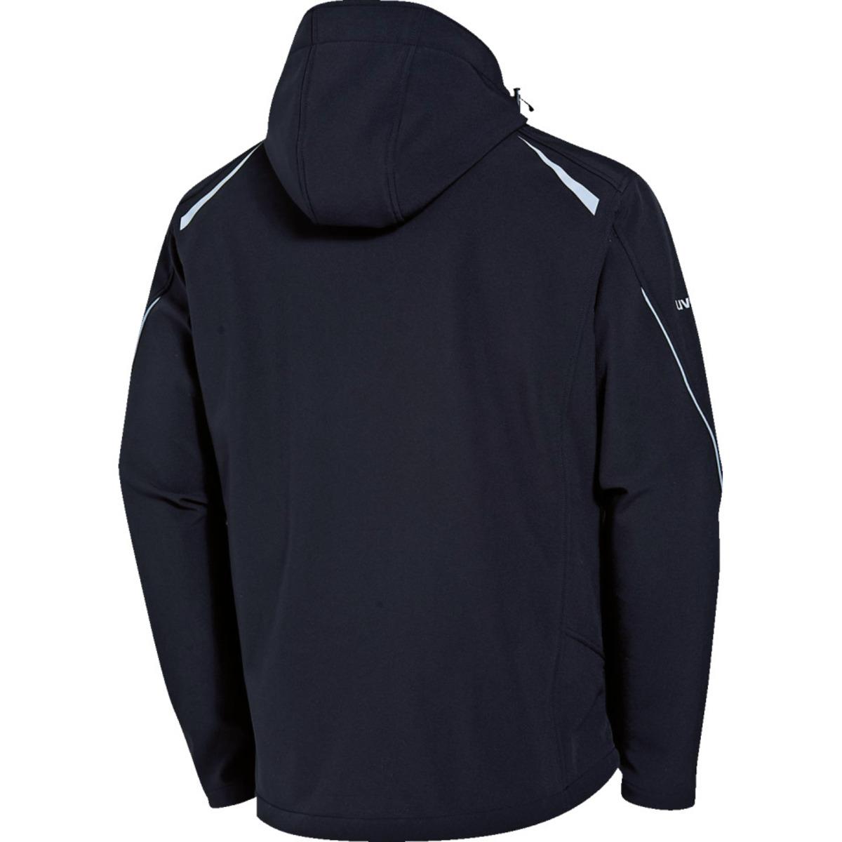 Winddichte und wasserabweisende uvex Softshell Jacke 8984 mit weitenverstellbarer Kapuze, Tasche im Brustbereich, 2 seitliche Hüfttaschen, verlängerte Rückenpartie und Reflexdetails für bessere Sichtbarkeit, verdeckter Frontreißverschluss, Saum mit Gummizug und Stopper zur individuellen Weitenverstellung, atmungsaktiv, waschbar bei 40°C.