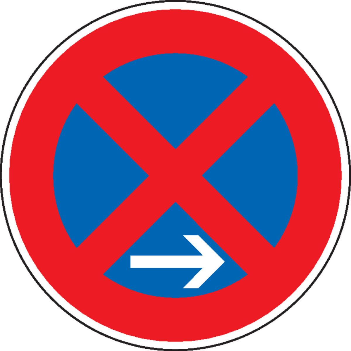 Verbotszeichen zur Kennzeichnung der Beendigung des Abschnitts auf der rechten Straßenseite, in dem es verboten ist, auf der Fahrbahn zu halten. Gilt für die Straßenseite, auf der es steht, hier in Fahrtrichtung rechts.