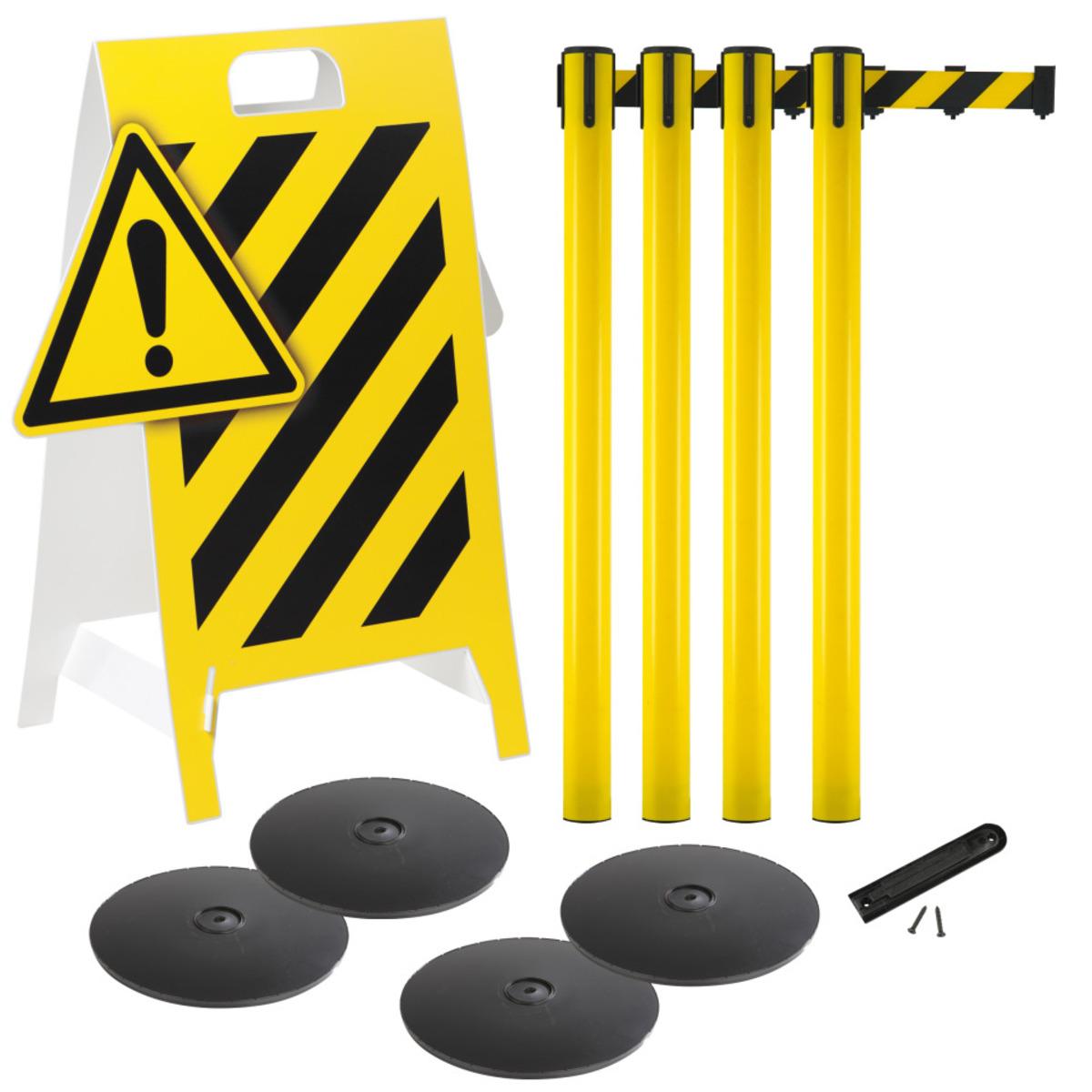 Auswahl: Vorteils-Set Absperrbereich, 4 Gurtpfosten, gelb/schwarz, Warnaufsteller Achtung!