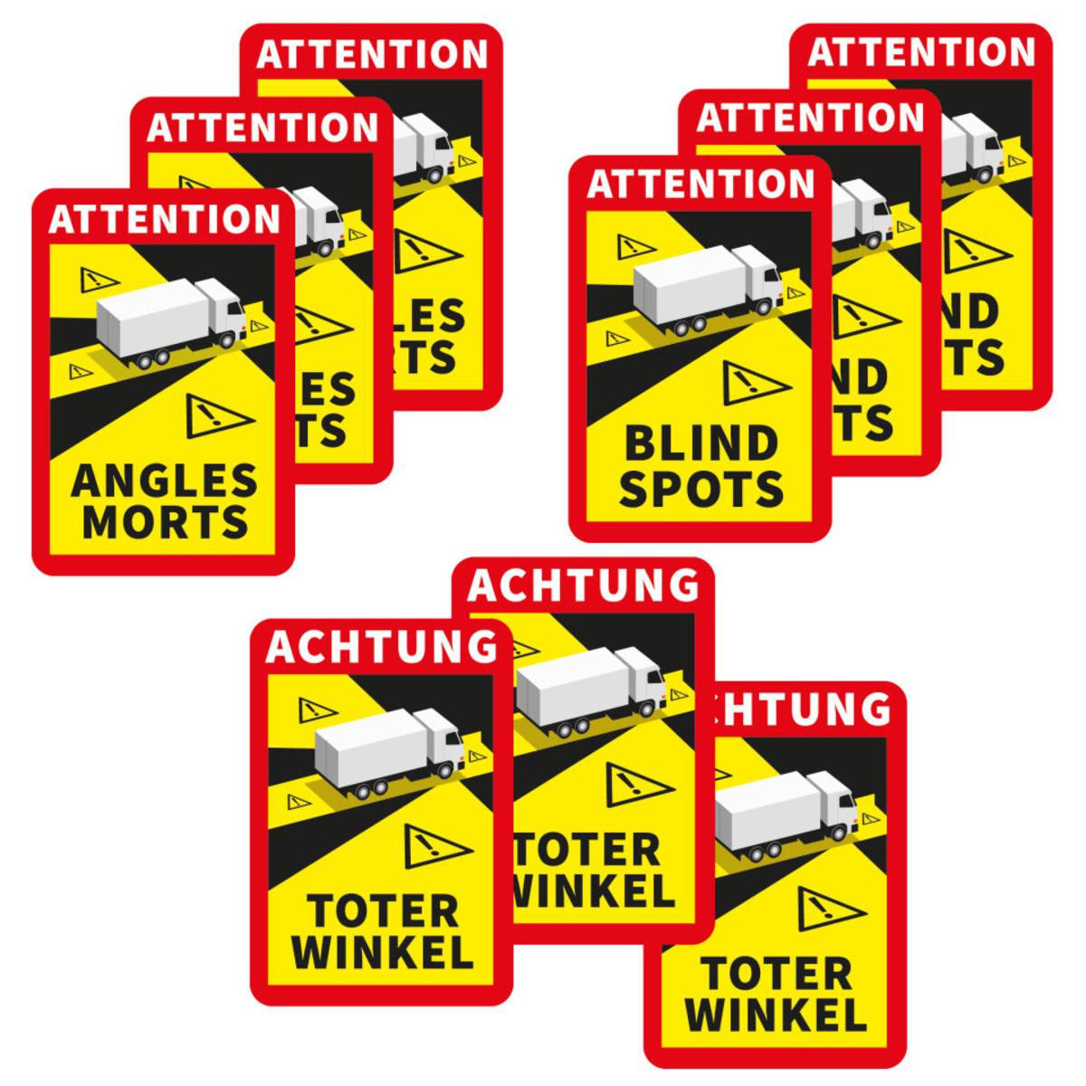 Auswahl: Vorteils-Set ACHTUNG TOTER WINKEL, DE/EN/FR, 9 Aufkleber, Folie, 250x170mm