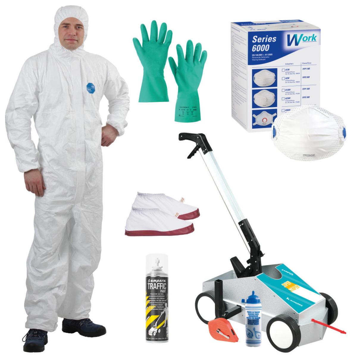 Vorteils-Set Bodenmarkierung für die staubfreie und saubere Anbringung von Bodenfarben inklusive persönlicher Schutzausrüstung.