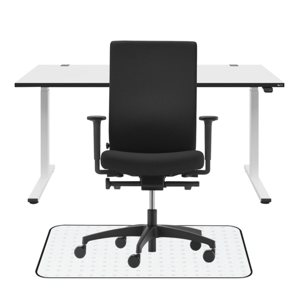 Vorteils-Set, welches einen höhenverstellbaren Schreibtisch, einen Drehstuhl sowie eine Bodenschutzmatte beinhaltet.