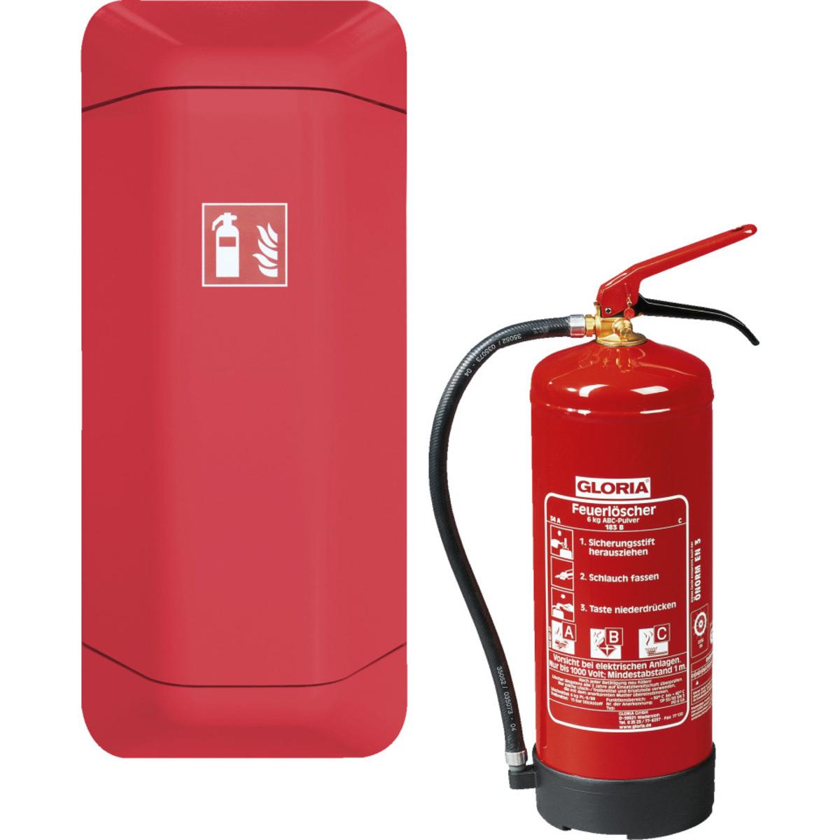 Vorteils-Set Pulverlöscher mit Schrank zur sicheren Aufbewahrung und schnellem Zugriff im Notfall.