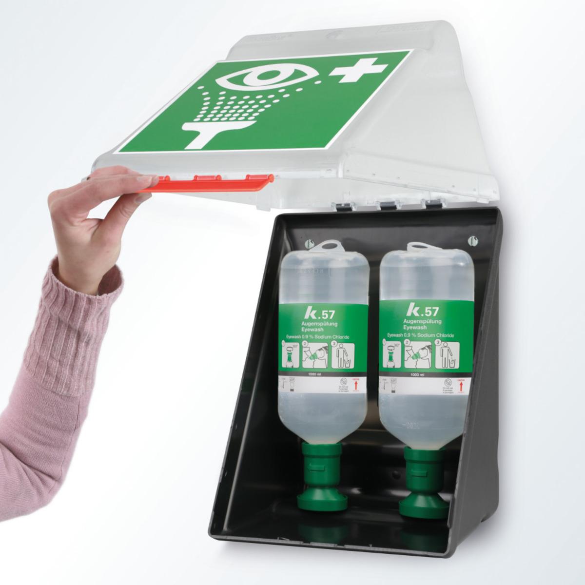 SecuBox® Augenspülstation zur Aufbewahrung von Augenspülflaschen. Die Spülflaschen sind vor Staub und Spritzwasser geschützt und bleiben so lange sauber und einsatzberei. Der Schutzdeckel lässt sich bequem mit einer Hand öffnen und arretieren.