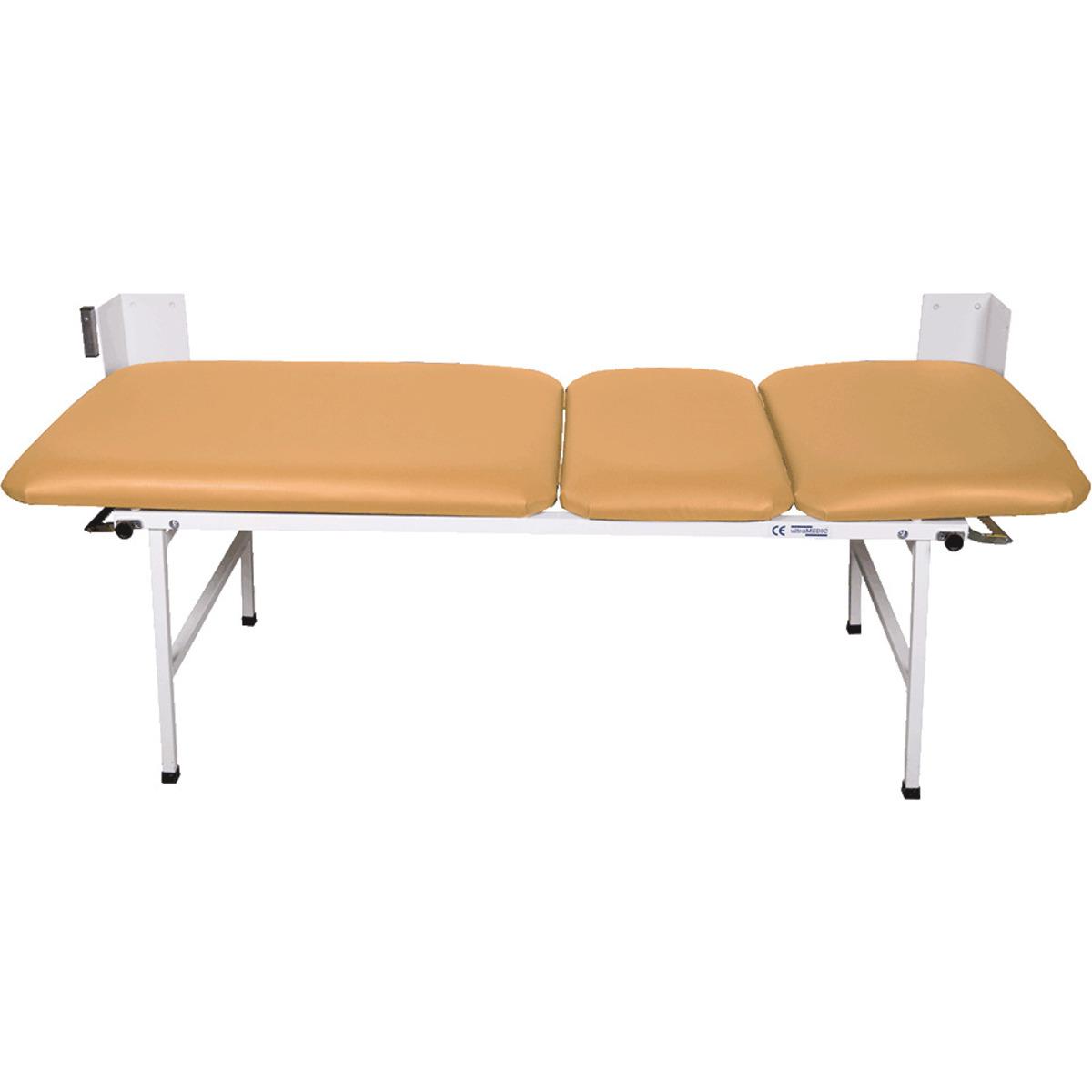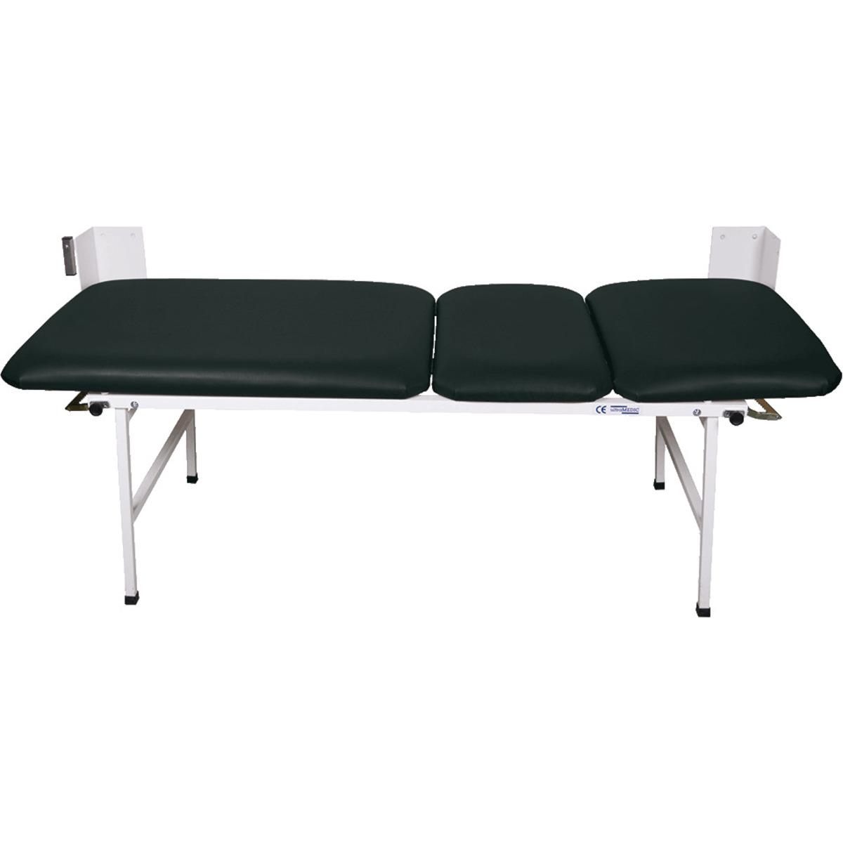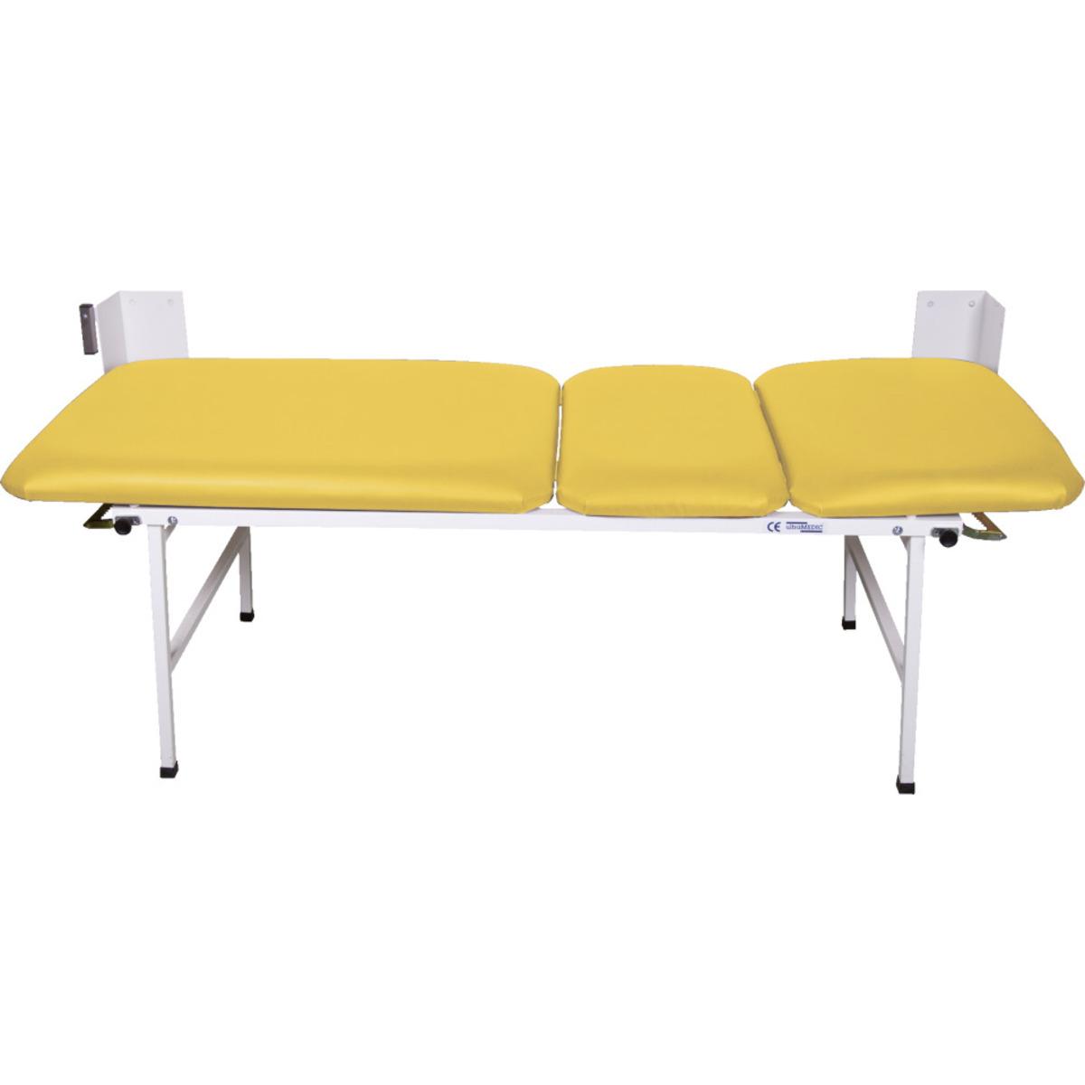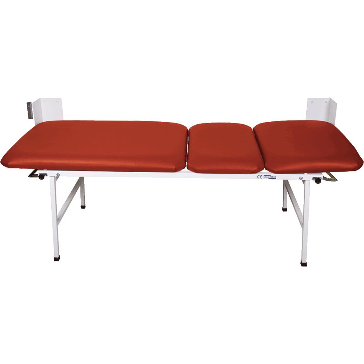 Bequeme, 3-teilige Wanklappliege für Sanitäts- und Ruheräume. Mit Gasdruckfedern zum einfachen Aufklappen der Füße. Mit verstellbarem Kopf- und Fußteil.