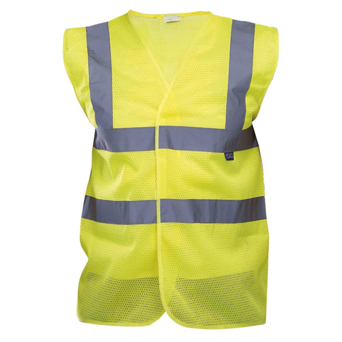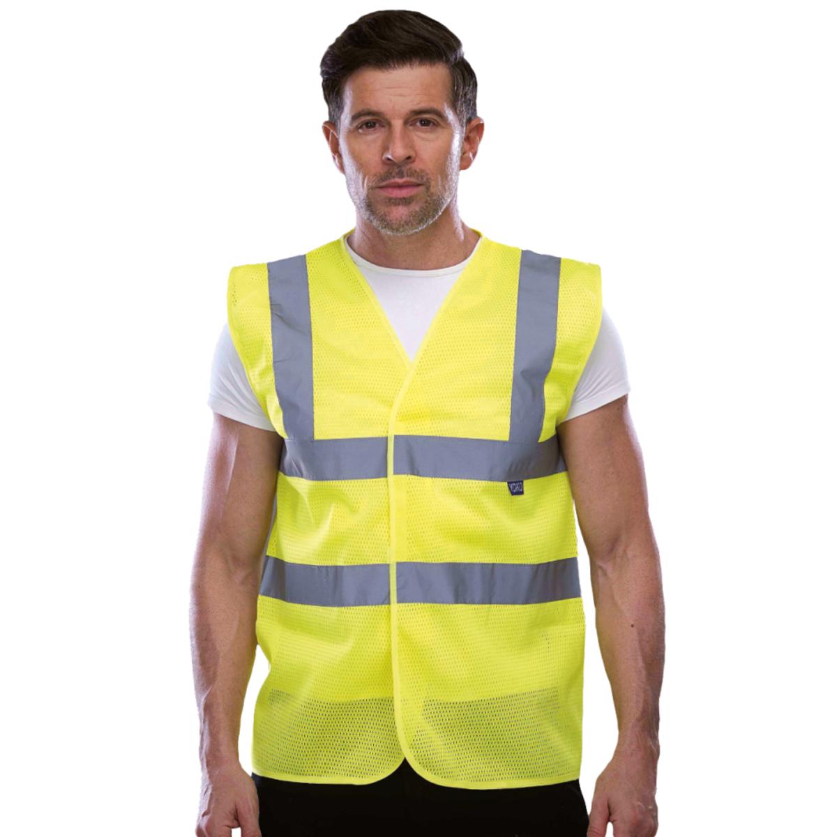 Hochsichtbare Warnweste aus leichtem Netzgewebe, ideal für Arbeitsplätze mit großer Hitzebelastung.