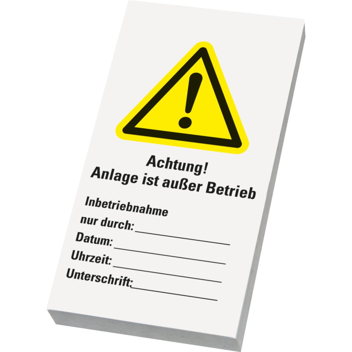 Beschriftbarer Wartungsanhänger und -aufkleber mit dem Ausdruck "Achtung! Anlage ist außer Betrieb" zur deutlichen Warnung bei großen, unübersichtlichen Maschinen.
