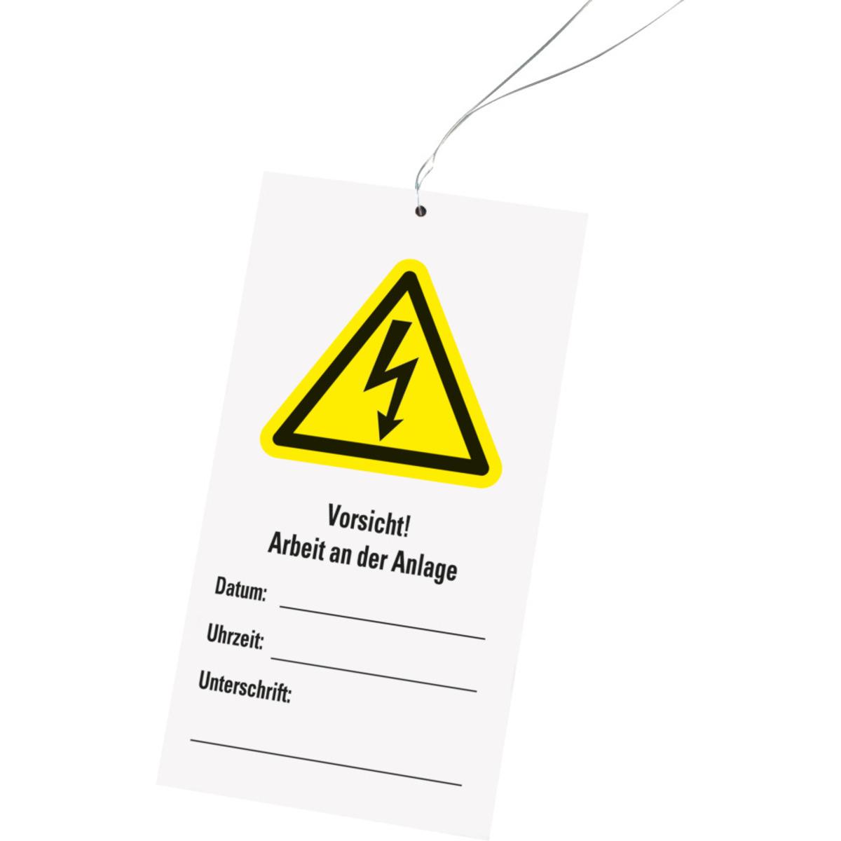 Beschriftbarer Wartungsanhänger mit dem Ausdruck "Vorsicht! Arbeit an der Anlage" zur deutlichen Warnung vor elektrischer Spannung bei großen, unübersichtlichen Maschinen.