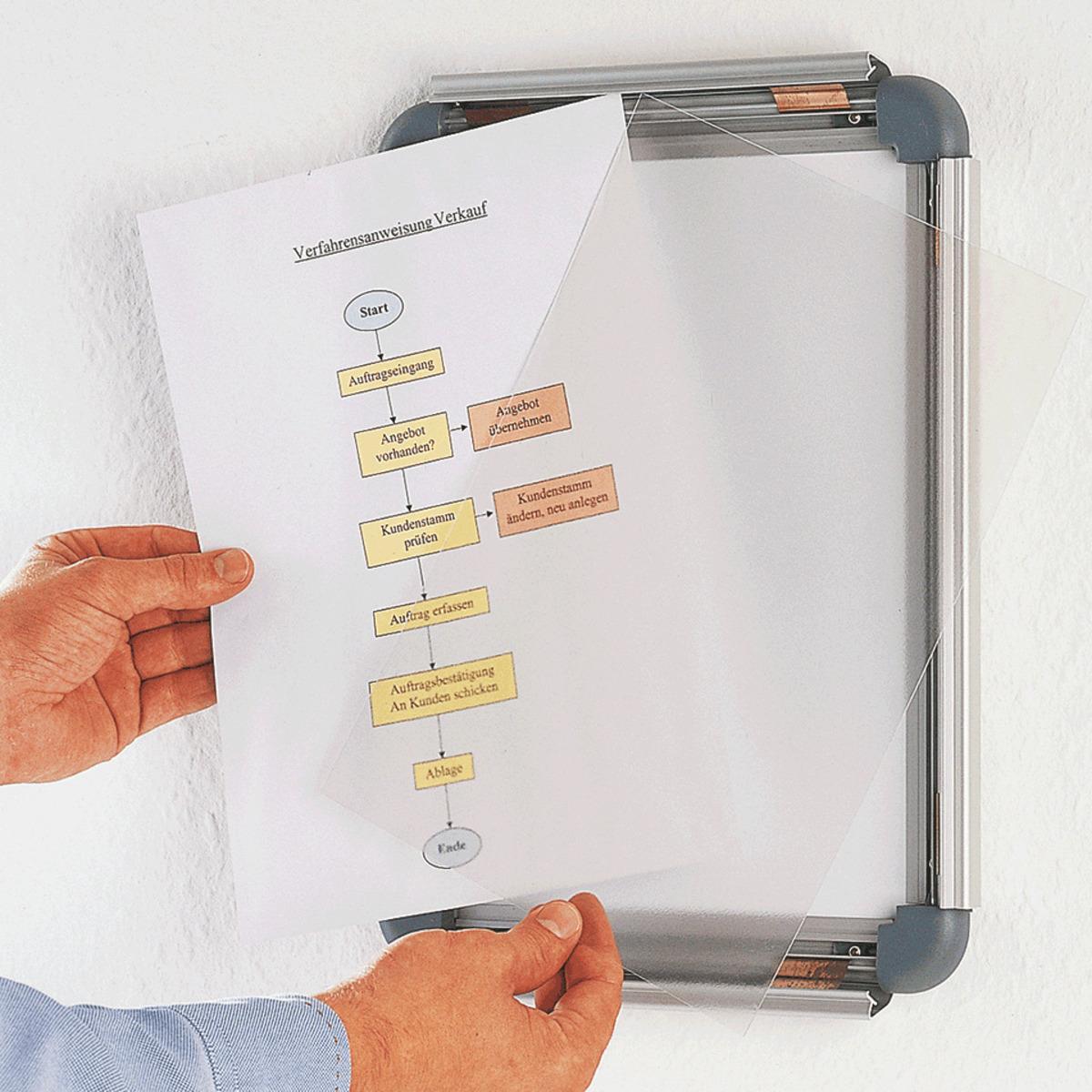 Wechselrahmen mit Klapp-Profi, runden Ecken und splitter- und reflexfreier Kunststoffscheibe. Stabile Rückplatte aus Polypropylen. Beschriftbar mit wasserlöslichen Filzstiften. Für den Einsatz im Innen- und geschützten Außenbereich