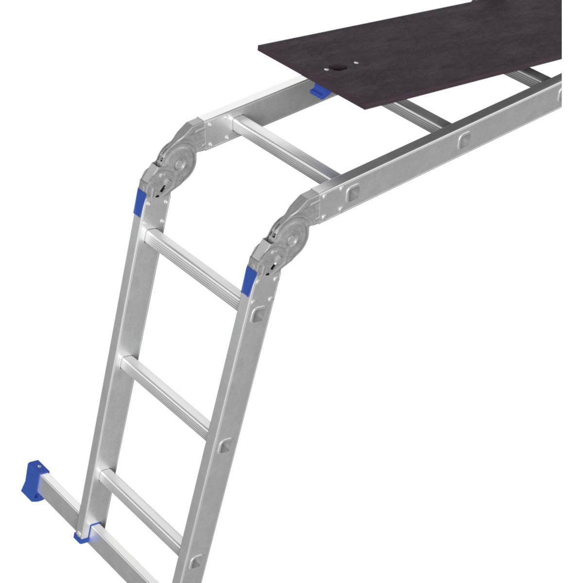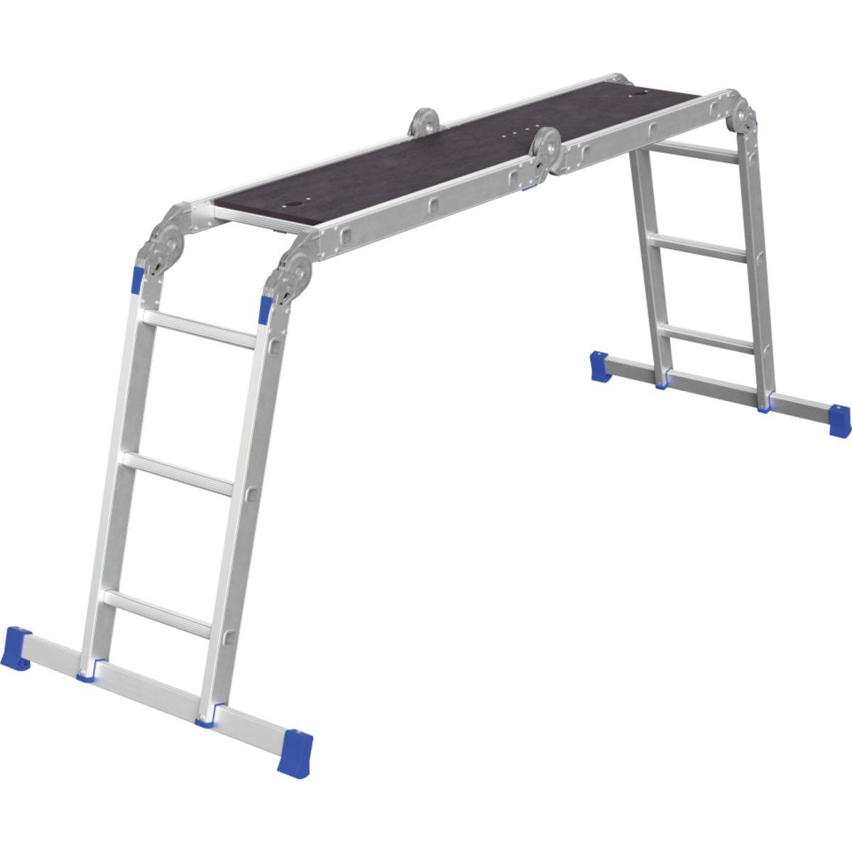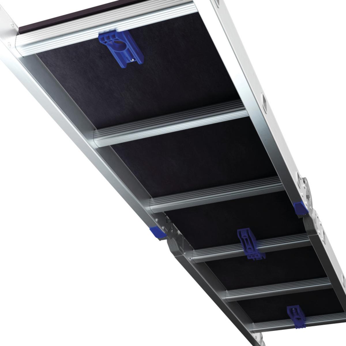 WERNER® Vielzweckleiter, 4-teilig mit abnehmbarer rutschfeste Arbeitsplattform und 4x3 Sprossen. Die Quertraversen sorgen für einen festen Stand. Eine kompakte Abmessung samt Scharniersystem, sorgt für ein kompaktes Transport und Lagermaß