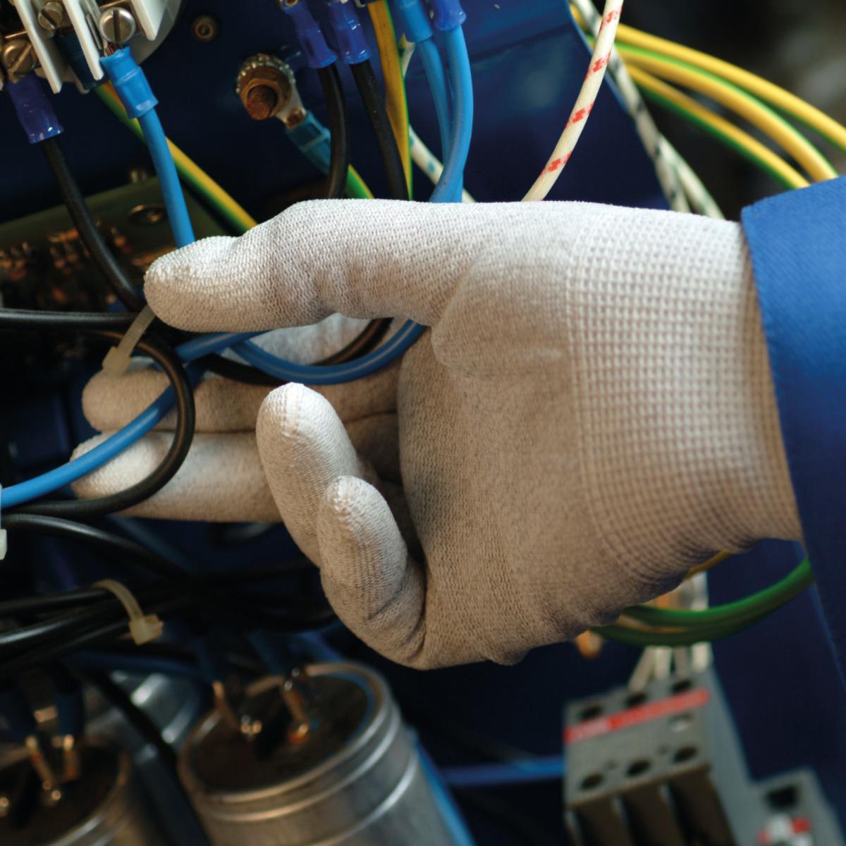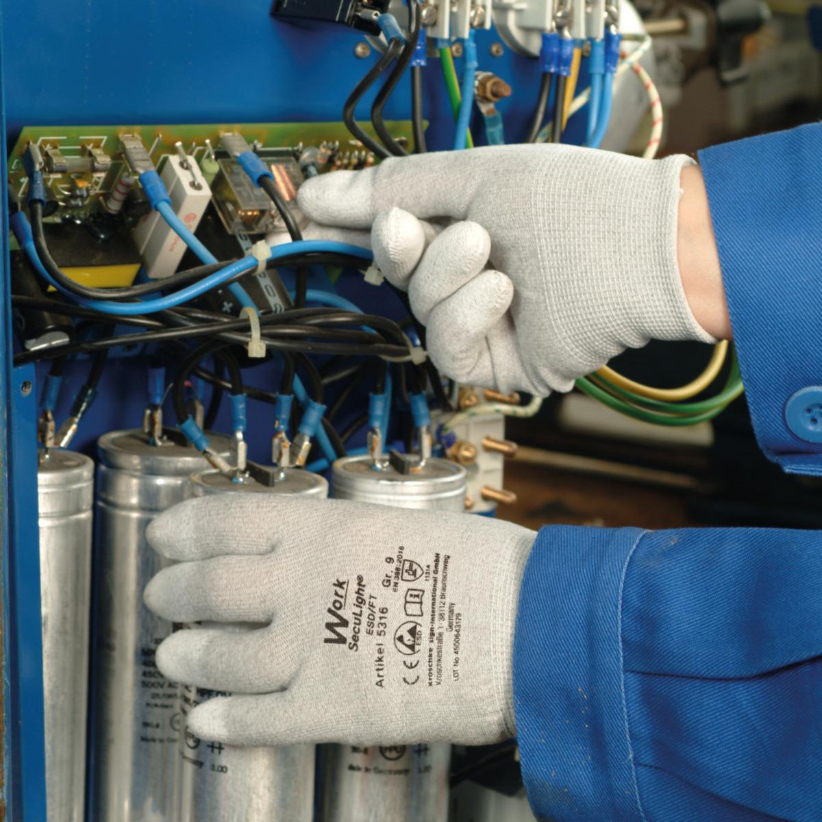 Besonders feinfühliger und nahtloser Strickhandschuh SecuLight® ESD/FT mit hochwertiger Beschichtung an den Fingerspitzen, geringe Ladungsgenerierung und hohe Ladungsableitung für den Einsatz in ESD-Bereichen oder Arbeiten mit elektronischen Bauteilen, Verunreinigung durch Faserverlust nahezu unmöglich