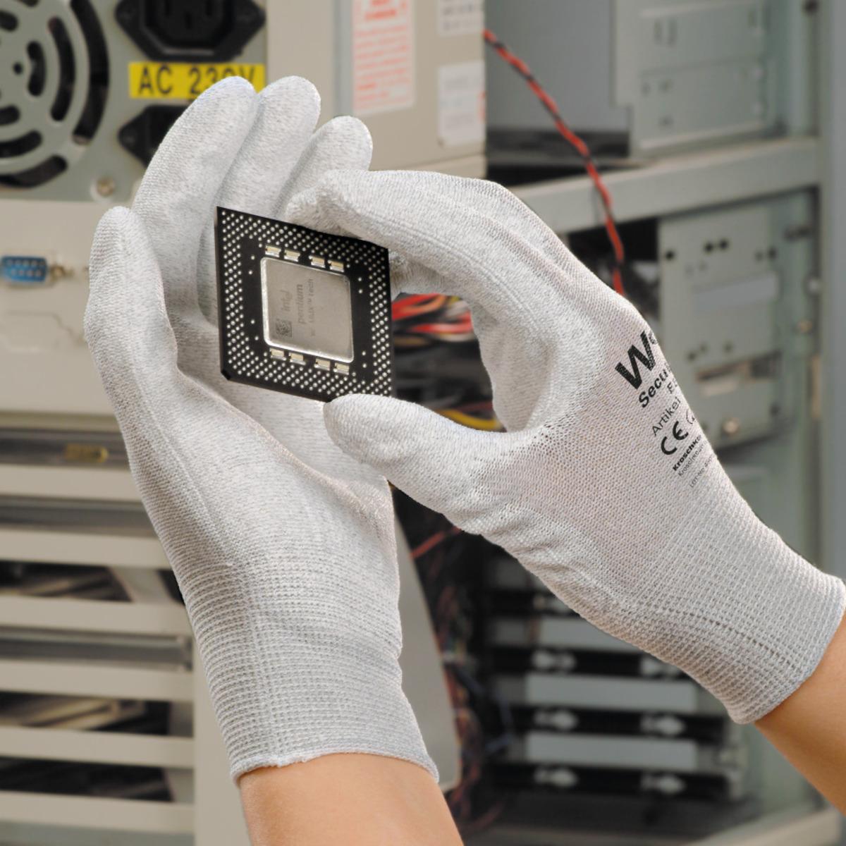 Besonders feinfühliger und nahtloser Strickhandschuh SecuLight® ESD/P mit hochwertiger Beschichtung auf der Handinnenfläche und den Fingerkuppen, geringe Ladungsgenerierung und hohe Ladungsableitung für den Einsatz in ESD-Bereichen oder Arbeiten mit elektronischen Bauteilen, Verunreinigung durch Faserverlust nahezu unmöglich