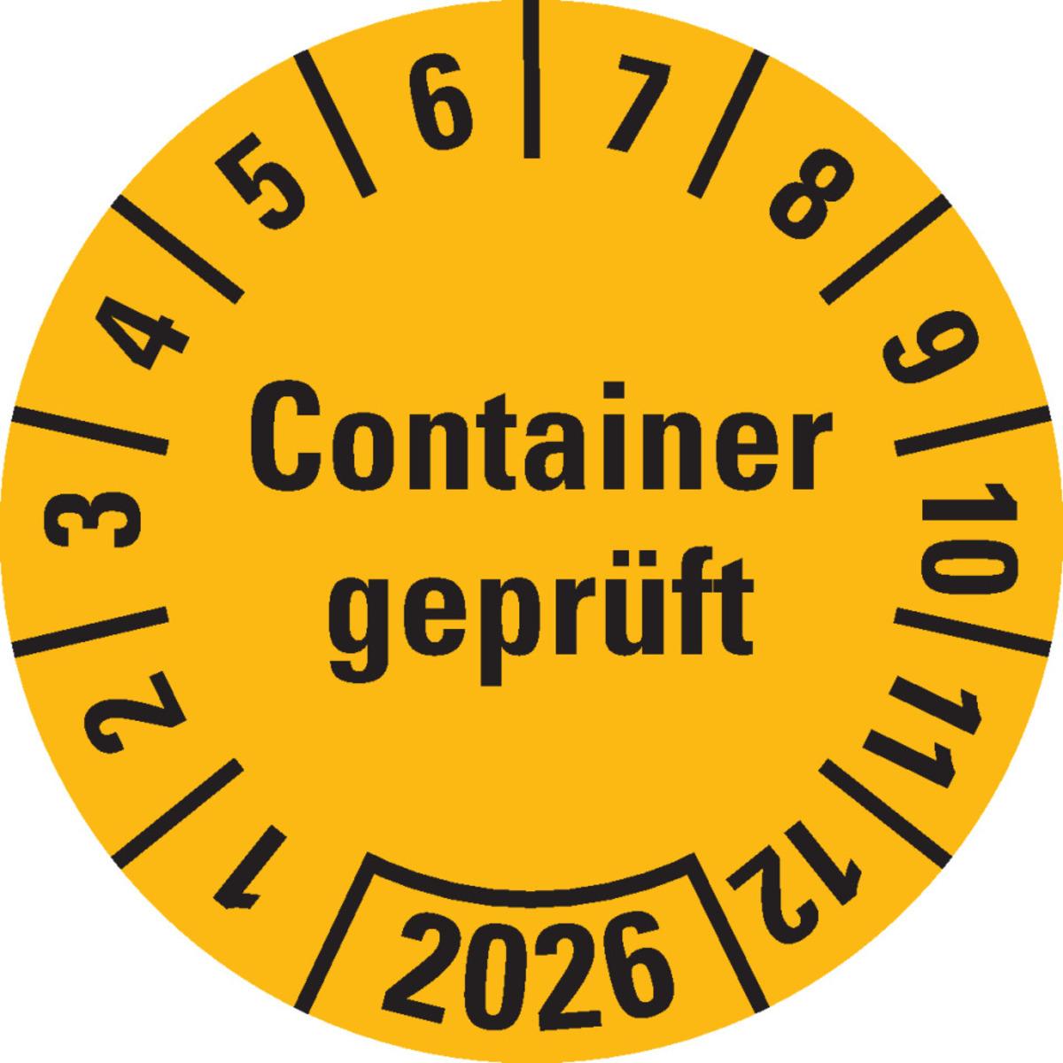 Auswahl: Prüfplakette Container geprüft 2026, gelb, Hochleistungsfolie, Ø 30mm, 18/Bogen
